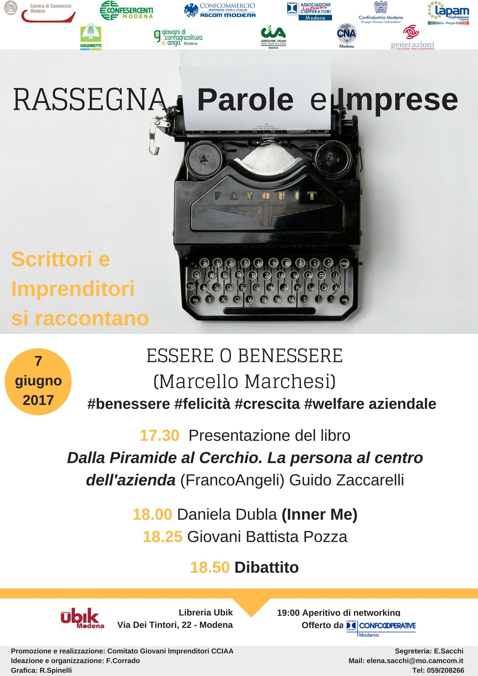 Prosegue la rassegna Parole e Imprese – Scrittori e Imprenditori si raccontano, organizzata dal Comitato per l'imprenditoria Giovanile. Il secondo incontro è previsto per mercoledì 7 giugno ore 17,30 presso la libreria Ubik di Modena. La partecipazione è libera e gratuita. Il tema della serata sarà la "persona" e la relazione al centro dell' impresa, ma anche ma anche al centro dello spazio pubblico. Programma
