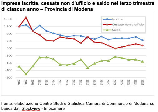 Sono in leggero aumento le imprese modenesi nel terzo trimestre del 2025: con 53 imprese registrate in più rispetto a giugno risultano 69.688 a fine settembre, pari ad una crescita dello 0,1%. Il confronto con l'anno precedente appare però negativo (-0,4%), migliore tuttavia sia del dato nazionale (0,6%), che di quello regionale (-0,8%).