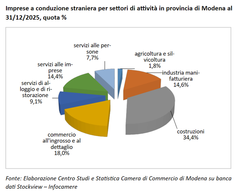 Sul territorio modenese le aziende guidate da stranieri risultano particolarmente concentrate in due settori: le costruzioni con 3.289 imprese e una quota del 34,4%, e il commercio con 1.724 unità ovvero il 18,0% del totale. Rilevanti anche le quote della manifattura (1.398 imprese, 14,6%), dei servizi alle imprese (1.376 unità, 14,4%) e della ristorazione (874 imprese, 9,1%). Nell'ambito dell'industria manifatturiera, il 43,4% delle imprese opera nel tessile-abbigliamento (606).