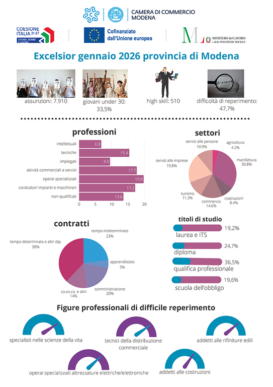 Nel mese di gennaio 2026 sono previste in provincia di Modena 7.910 assunzioni; tuttavia, in 48 casi su 100 le imprese prevedono di incontrare difficoltà a trovare i profili desiderati. Per una quota pari al 64% delle entrate si richiede esperienza specifica; le ricerche di giovani under 30 sono un terzo del totale mentre le assunzioni di immigrati sono pari al 27%. Risale al 18% la quota di imprese che intendono assumere.