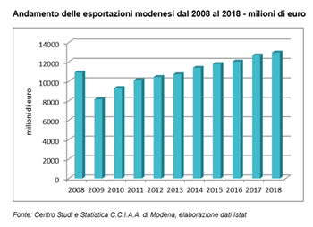 Anche l'intero dato annuale risulta positivo, con un valore assoluto pari a 12.956 milioni di euro, il più alto dal 2008 ad oggi, infatti dall'anno di minimo raggiunto nel 2009 con la crisi mondiale, il dato annuale delle esportazioni modenesi non è mai stato in calo.