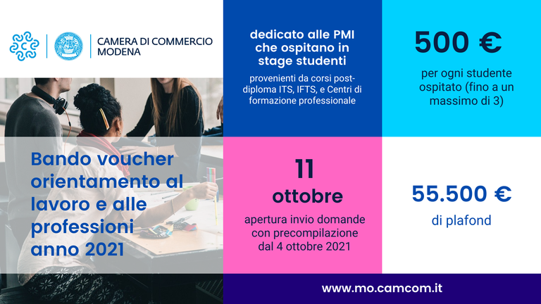 La Camera di Commercio di Modena ha varato un bando che prevede contributi a fondo perduto (voucher) a favore di piccole e medie imprese disposte ad ospitare in stage curricolari studenti inseriti nei percorsi post-diploma ITS, nell'Istruzione e Formazione Tecnica Superiore (IFTS) e nei Centri di Formazionale Professionale (CFP). Le risorse stanziate ammontano complessivamente a 55.500 Euro.