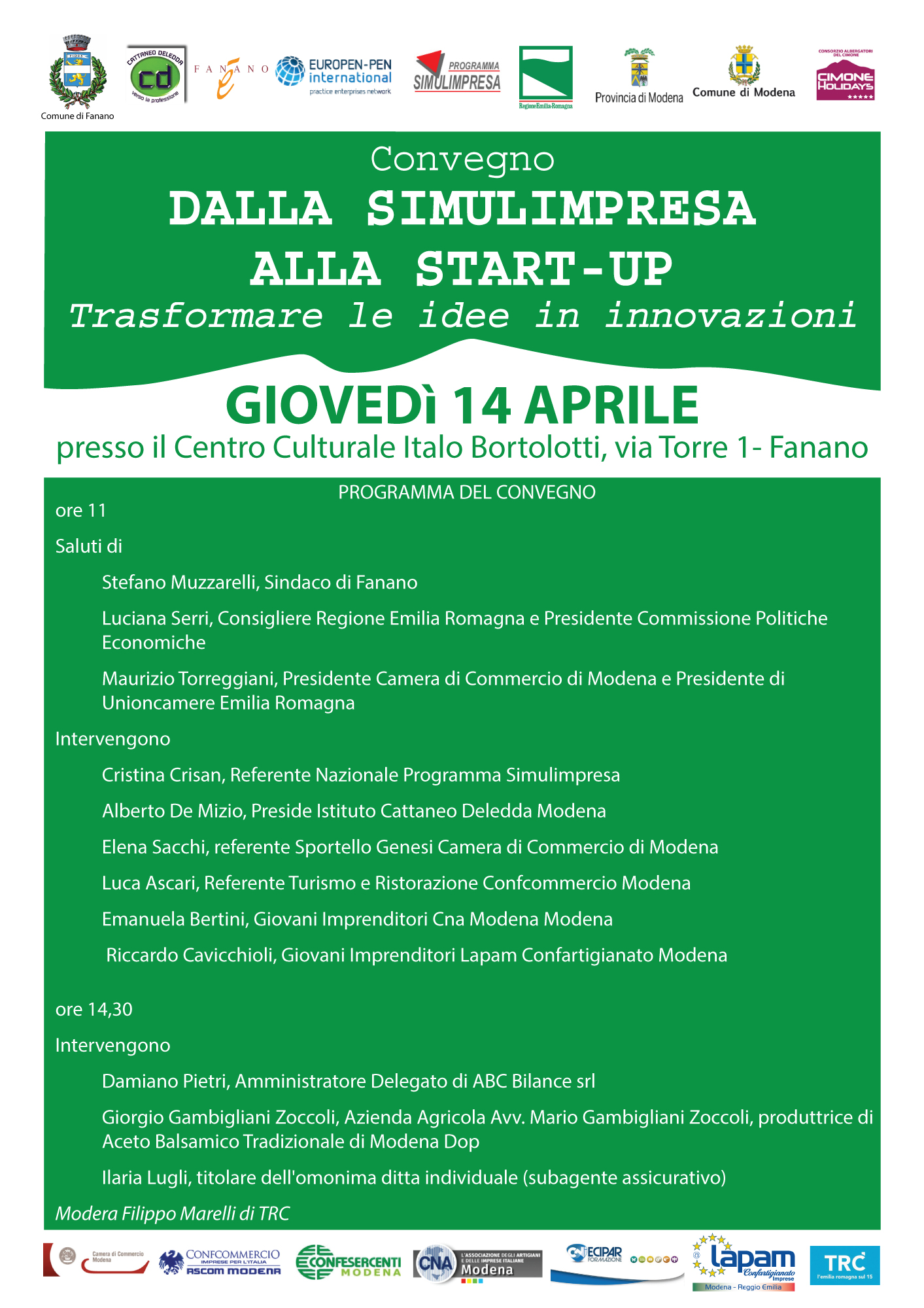 Il programma della Fiera delle Imprese simulate, dopo la giornata di mercoledì 13 aprile dedicata all'allestimento degli stand al Palaghiaccio, propone giovedì 14 aprile, oltre al taglio del nastro della Fiera alle ore 9, il convegno alle ore 11, al Centro culturale Italo Bortolotti, dal titolo "Dalla Simulimpresa alla startup. Trasformare le idee in innovazioni" con la partecipazione di Patrizio Bianchi, assessore alla Scuola della Regione Emilia Romagna, Luciana Serri, il consigliere regionale e rappresentanti del mondo cooperativo. E sempre giovedì 14 aprile, alle 14,30 al Centro Bortolotti, la Camera di Commercio di Modena promuove un incontro con i giovani imprenditori modenesi con la presenza del presidente Maurizio Torreggiani.