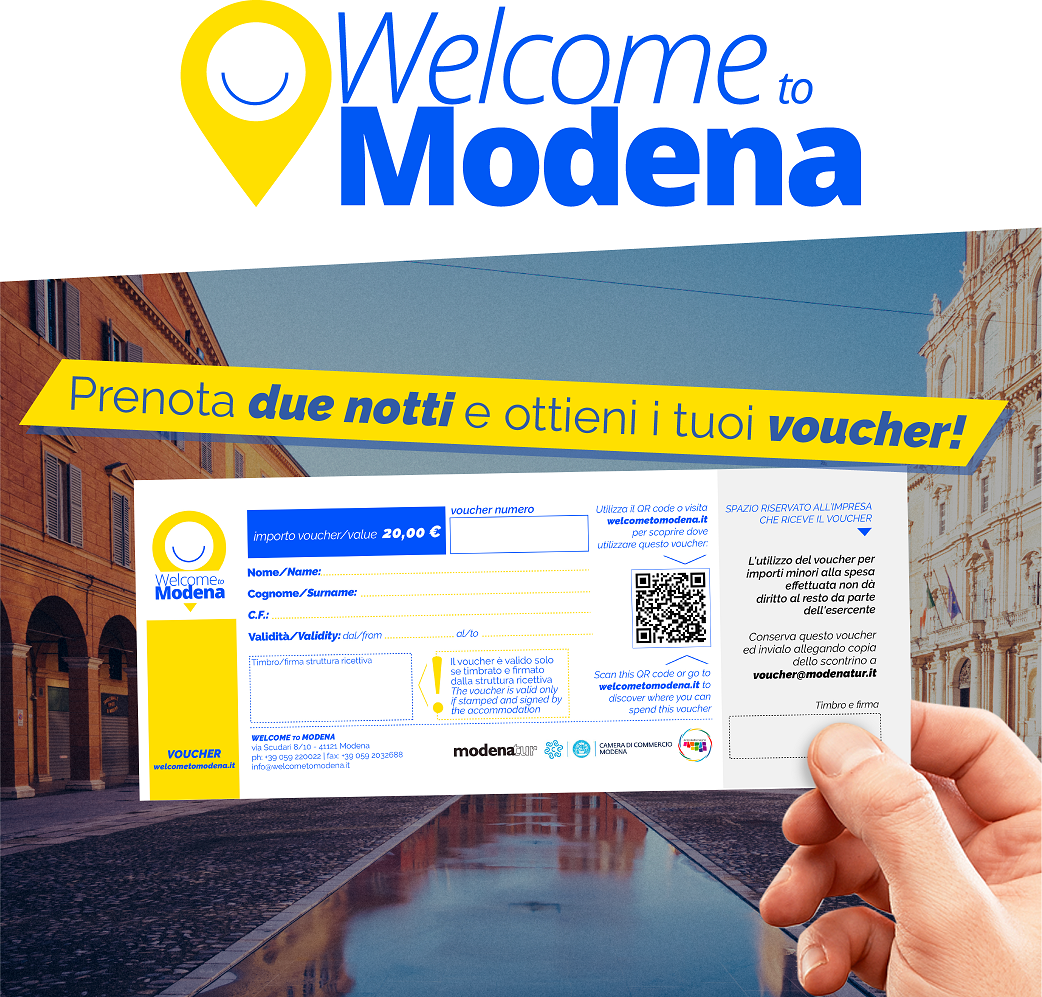 E' "Welcome to Modena" l'iniziativa sostenuta dalla Camera di Commercio di Modena e realizzata con la collaborazione di APT Servizi Emilia Romagna e Modenatur quale partner tecnico (welcometomodena.it). Il funzionamento dell'offerta è semplice: il turista dovrà prenotare almeno 2 pernottamenti su welcometomodena.it scegliendo tra più di 60 strutture ricettive del territorio modenese, dalla pianura all'Appennino. Al suo arrivo nell'albergo/agriturismo prescelto, riceverà in omaggio i voucher di un valore calcolato sul costo del suo soggiorno, prendendo come riferimento la tariffa di pernottamento e colazione.