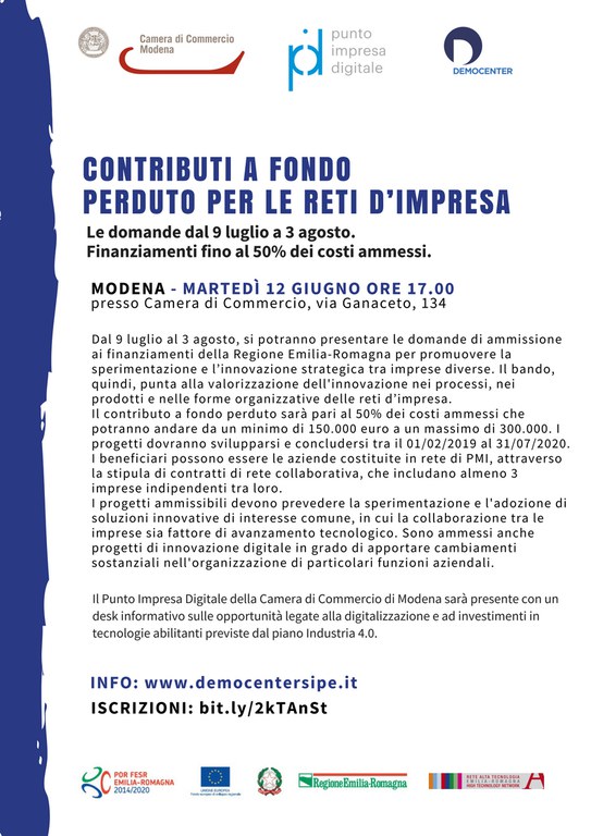 Il bando, quindi, punta alla valorizzazione dell'innovazione nei processi, nei prodotti e nelle forme organizzative delle reti d'impresa. I dettagli della proposta della Regione Emilia-Romagna saranno al centro dell'incontro promosso congiuntamente da Fondazione Democenter e Punto Impresa Digitale della Camera di Commercio di Modena per il pomeriggio di martedì 12 giugno, alle ore 17, presso la Sala Consiglio della stessa Camera di Commercio.