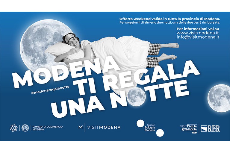 Scoprire le meraviglie della provincia di Modena diventa più conveniente con l'iniziativa "Modena ti regala una notte", pensata per incentivare i turisti a prolungare la loro permanenza nei fine settimana. A chi trascorrerà almeno due notti tra venerdì, sabato e domenica in una delle strutture ricettive provinciali, la Camera di Commercio rimborserà il costo dell'ultima notte.