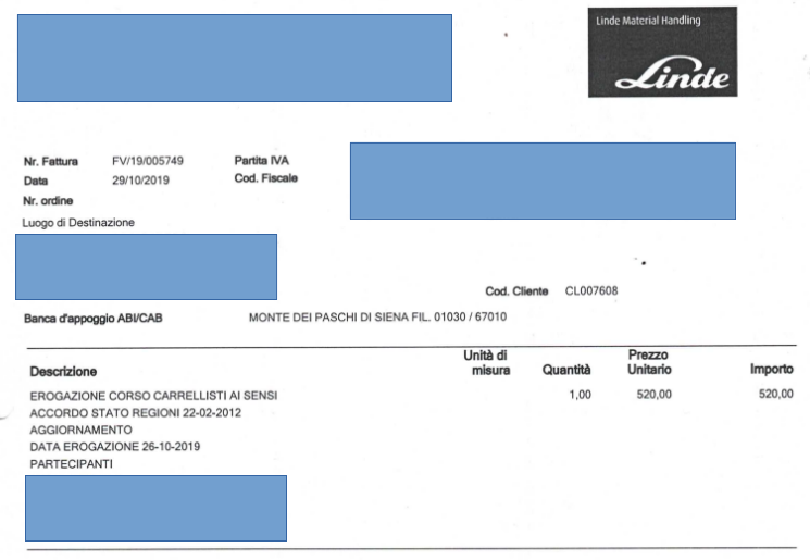 Una società, concessionaria ufficiale Linde MH di carrelli elevatori, ha erogato in data 26/10/2019 un corso di formazione a 4 persone per il rinnovo quinquennale della formazione prevista per gli addetti alla conduzione di carrelli elevatori;